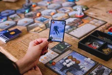 This natural rubber playmat for Expeditions has double-stitched edges for durability. It is double sided (one side with outlines for hexes, cards, and basecamp and one side just with art), and it fits all components for a 5-player game. It measures 900x900mm.
